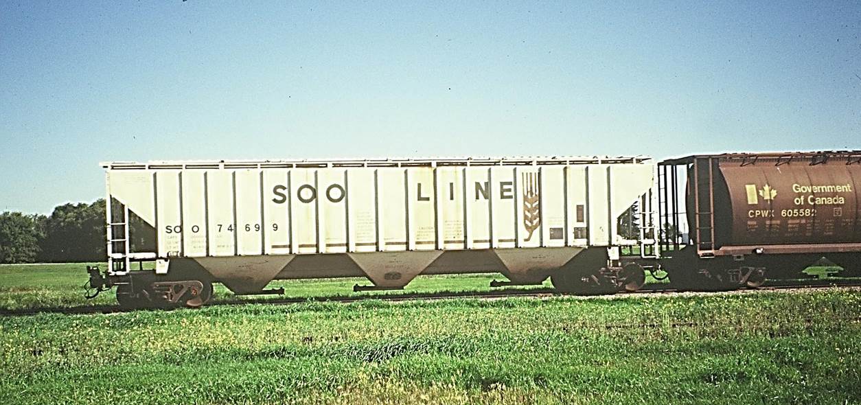1994/08, CPR/Napinka Sub. Mile 28. The end of the train in Mather. A different car – a 3 bottom Soo Line hopper. (Soo Line is owned by CPR) Note the “end of train device” attached to the end coupler of this car. This device provides a visual warning signal from the rear of the train in daytime and night time. As well, a vital function of this device is to indicate and regulate the brake line pressure by communicating with its’ partner device in the engineer’s cab. Because cabooses have already been taken out of service at this time, the conductor now rides in the engine. Distance verbal communication, instead of being done by telegraph, is now done by train phone and relay towers. (Click on photo for detail) © Text and Photos exclusive copyright of N. Froese.