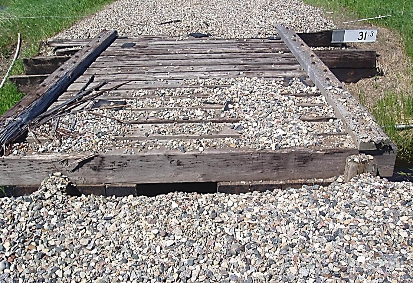 2011/05, CPR/Napinka Sub. Bridge at mile 31.3 after track and some ballast removed. This is a 16’ long timber span bridge built in 1983. View – looking W. (Information- BTRC/CPR files. Click on photo for larger image) Photo taken with a Minolta telephoto 70 – 210 mm zoom lens. © Photos exclusive copyright of N. Froese, Author.