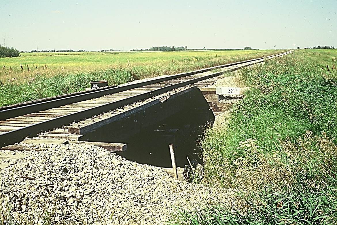 1994/08/04, CPR/Napinka Sub. Mile 32.4. This is a timber two span trestle built in 1969. Each span is 14’ in length. View – looking S.W. (Information – BTRC/CPR files. Click on photo for larger image) © Photos exclusive copyright of N. Froese, Author.