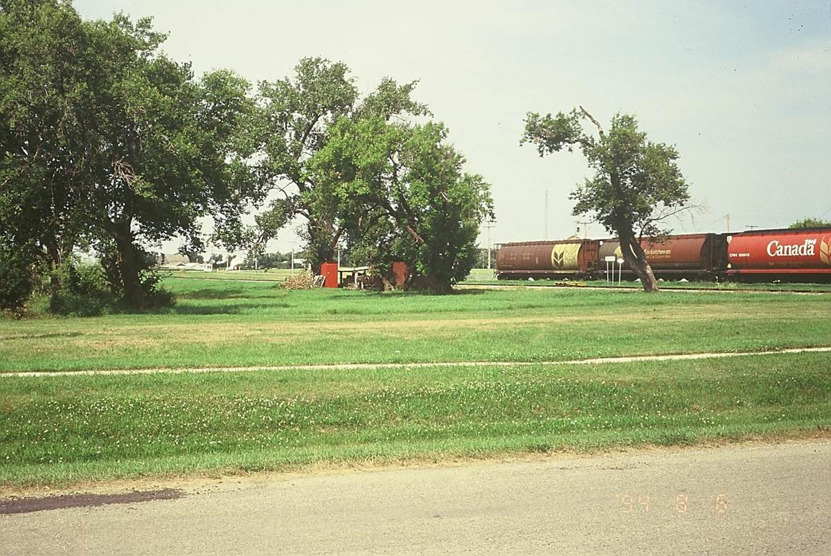 1994/08, CPR/Napinka Sub. Mile 35. Site of former Cartwright station . View – looking N.W. across the tracks from Broadway. Only 1 storage shed remains, (Tuscan red building in the trees) from a once busy site. Click on photo for detail. © Text and Photos exclusive copyright of N. Froese.