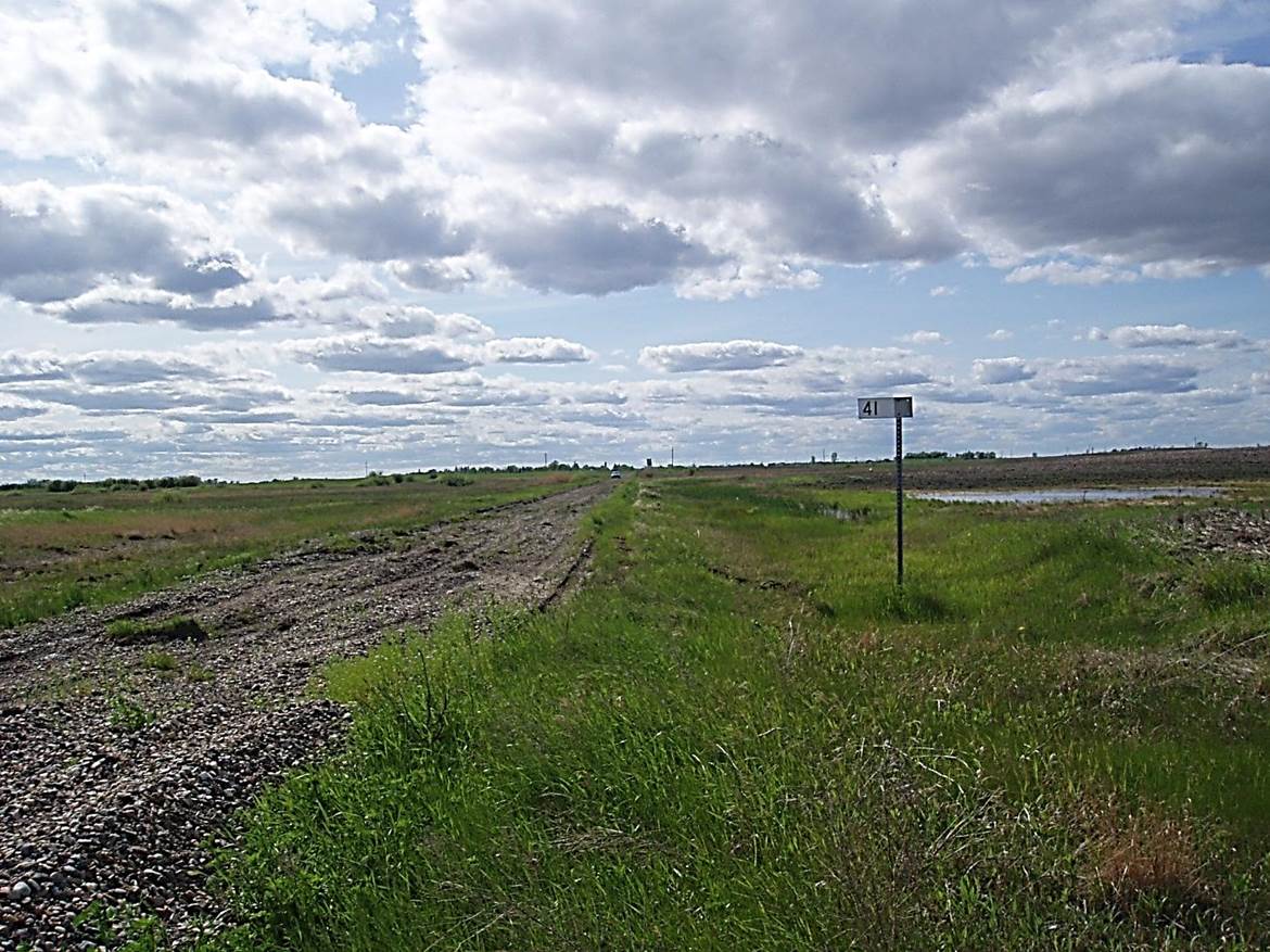 2011/05, CPR/Napinka Sub. Mile 41 with Holmfield Harrison Elevators in the distance. Much of the rail bed gravel has been taken up, and what is left is a muddy path. Click on photo for detail. © Text and Photos exclusive copyright of N. Froese.