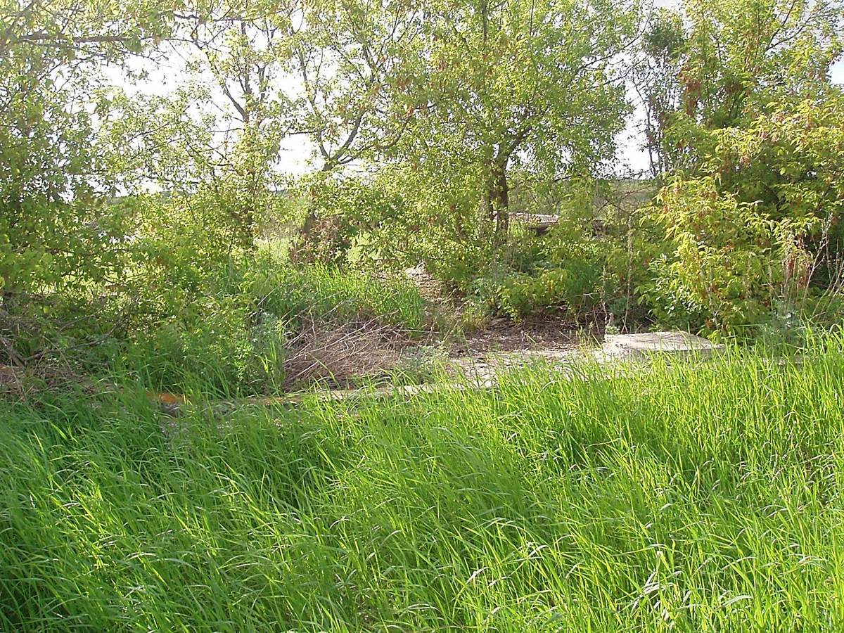 2011/05, CPR/Napinka Sub. Mile 42.8 W. end of Holmfield Yard. View – close-up of the overgrown octagonal concrete base of the former water tower at Holmfield. Click on photo for detail. © Text and Photos exclusive copyright of N. Froese.