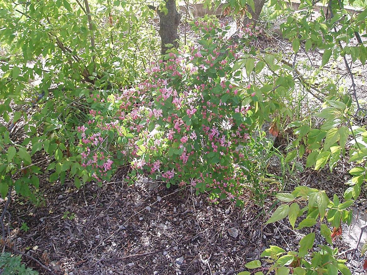 2011/05, CPR/Napinka Sub. Mile 42.8. Inside the water tower base with a fragrant Pink Honeysuckle plant – concrete foundation visible in upper right of photo. A symbol of sweeter times on the railway. Click on photo for detail. © Text and Photos exclusive copyright of N. Froese.