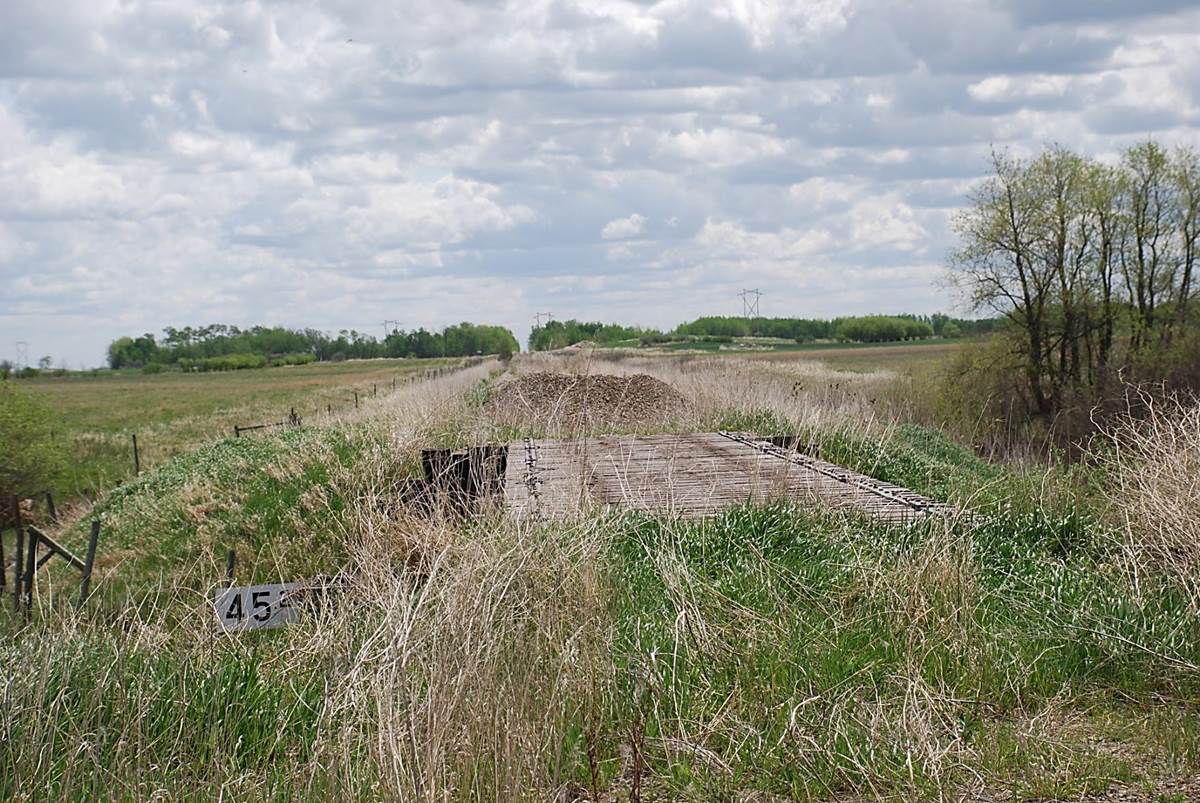 2012/05, CPR/Napinka Sub. Mile 45.2. This is the same S.T. Bridge 90 feet long consisting of 6 spans. View – looking S.E. back towards Holmfield. Click on photo for detail. © Text and Photos exclusive copyright of N. Froese.