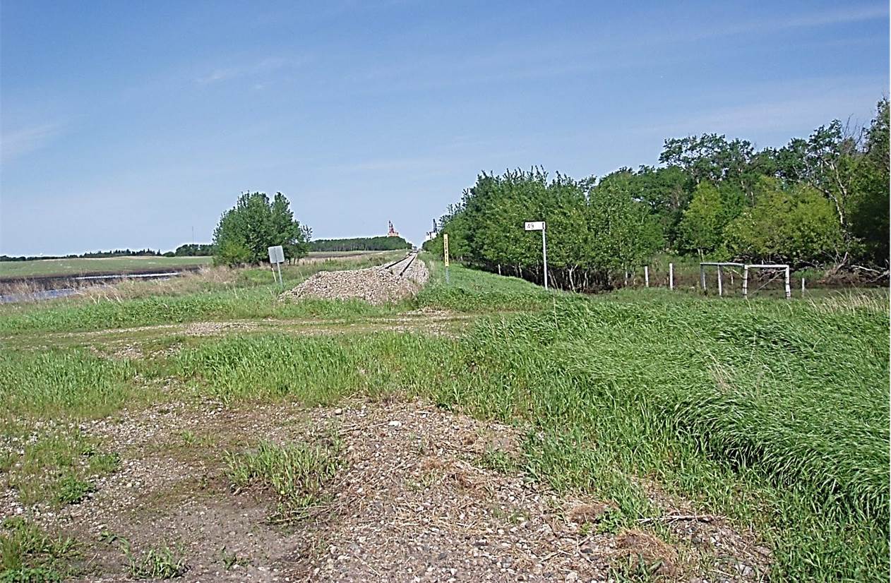 2011/05 CPR/Napinka Mile 49. View – looking N.W. to Killarney, MB. This was the end of the Boundary Trail Railway Co. property until its sale in May, 2012. The track in the photo is the still active CP line going on to Killarney and eventually to Napinka were the line joins up with the Estevan sub. which is part of the CPR Brandon division. Click on photo for detail. © Text and Photos exclusive copyright of N. Froese.