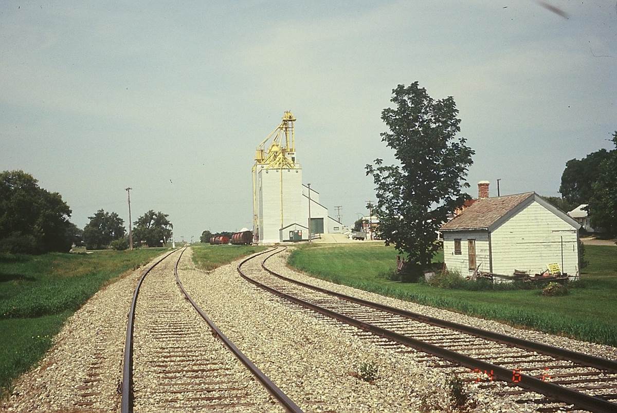 1994/08, CPR/Napinka Sub. Mile 35. Cartwright yard with nicely ballasted track. Manitoba Pool Elevator with grain hoppers in the distance. Click on photo for detail. © Text and Photos exclusive copyright of N. Froese.